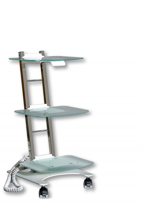 Włoskie stoliki zabiegowe firmy Stedy na urządznia wolnostojące typu: skalery, endometry, fizjodyspensery, piaskarki, urządzenia do endodoncji . Posiadają szklane lub metalowe regulowane półki oraz gniazda elektryczne.