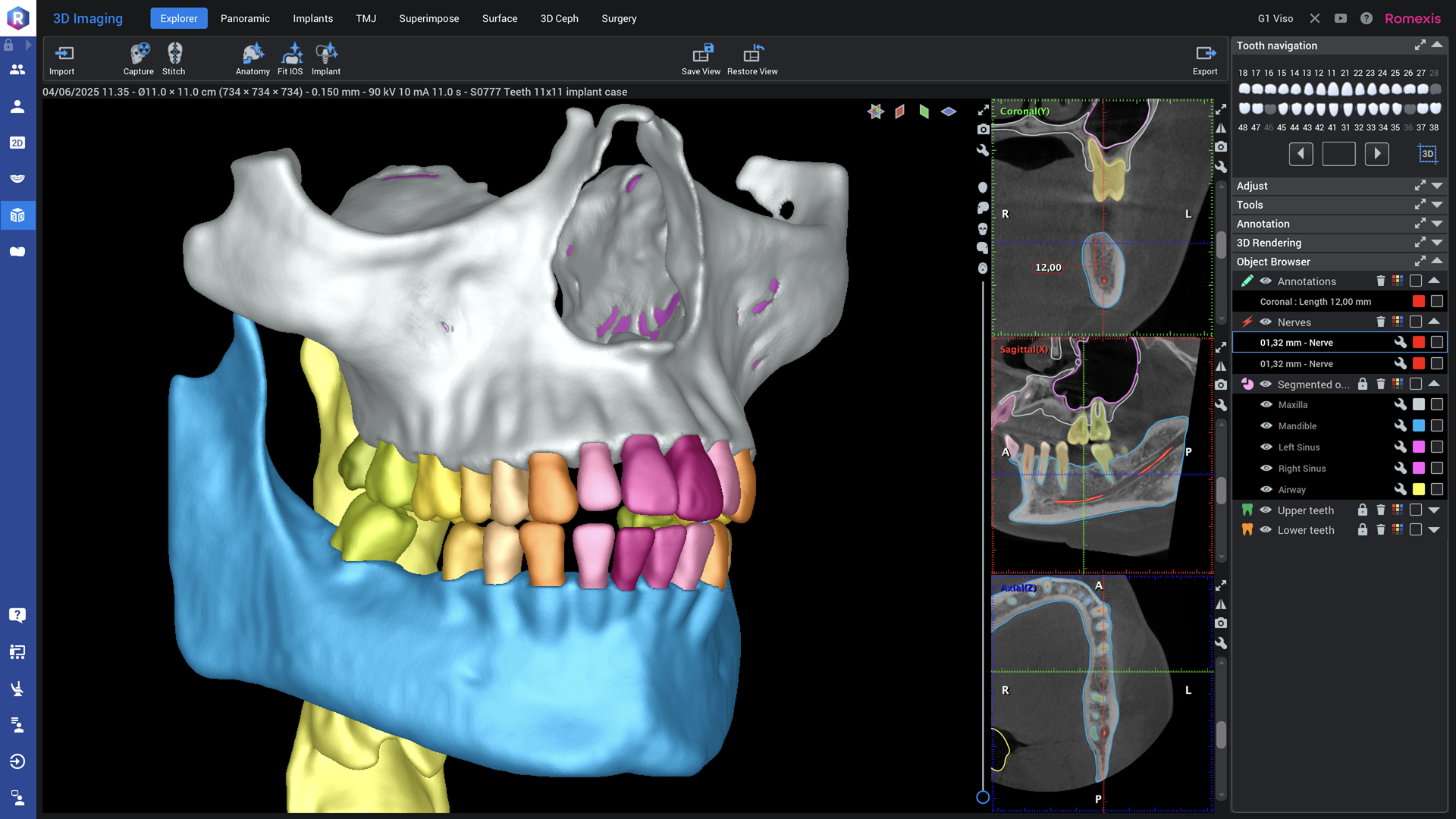 Badanie tomograficzne CBCT to technologia obrazowania RTG, polegająca na wykonaniu zdjęć pacjenta w 2D pod różnymi kontami. W oparciu o projekcje 2D tworzy się obraz wolumetryczny 3D. Dzięki zaawansowanemu oprogramowaniu Romexis można przeglądać obrazy pod każdym kątem, w tym płaszczyznę osiową, czołową, strzałkową oraz przekroje.