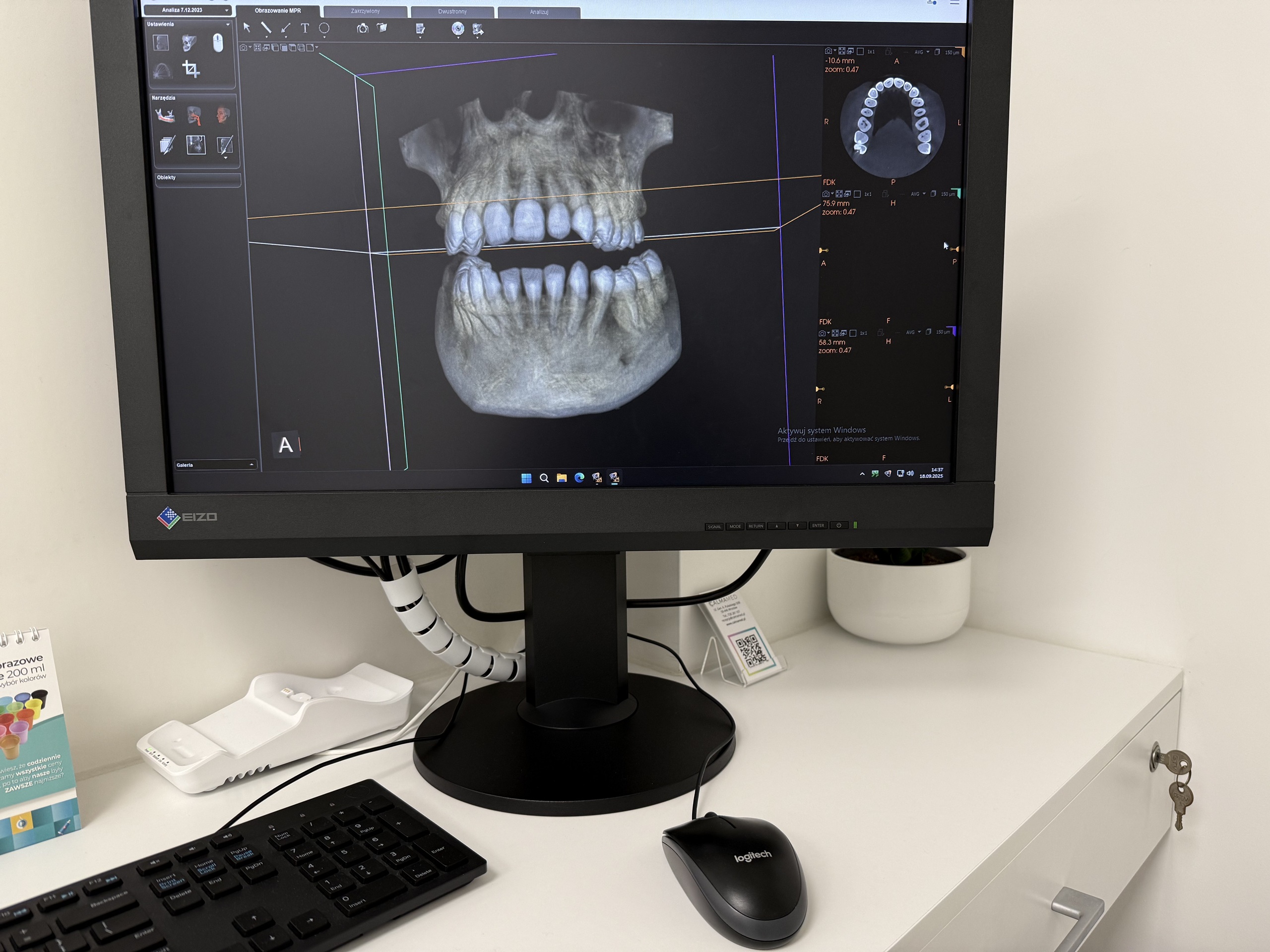 - tomogrfa w bdb stanie, dodatkowo komputer z CS MAR- redukcja metalowych artefaktów i mocniejszy kontrast, medyczny monitor i fartuch